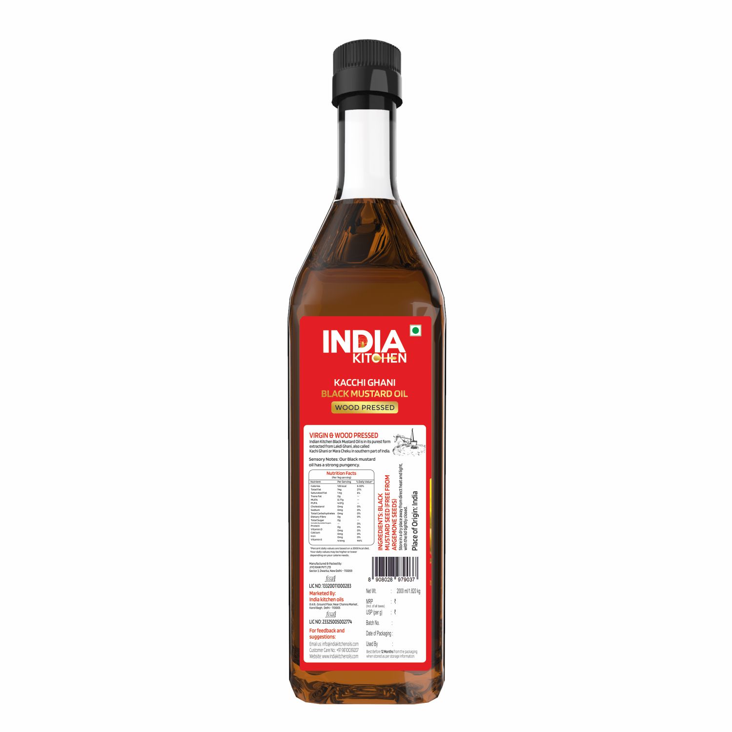 India Kitchen Kacchi Ghani Black Mustard Oil is traditionally wood-pressed from premium black mustard seeds to deliver a strong natural aroma and authentic pungent taste. Free from chemicals and argemone seeds, it is ideal for traditional Indian cooking, pickles, tadka, and deep frying—just like generations have trusted.