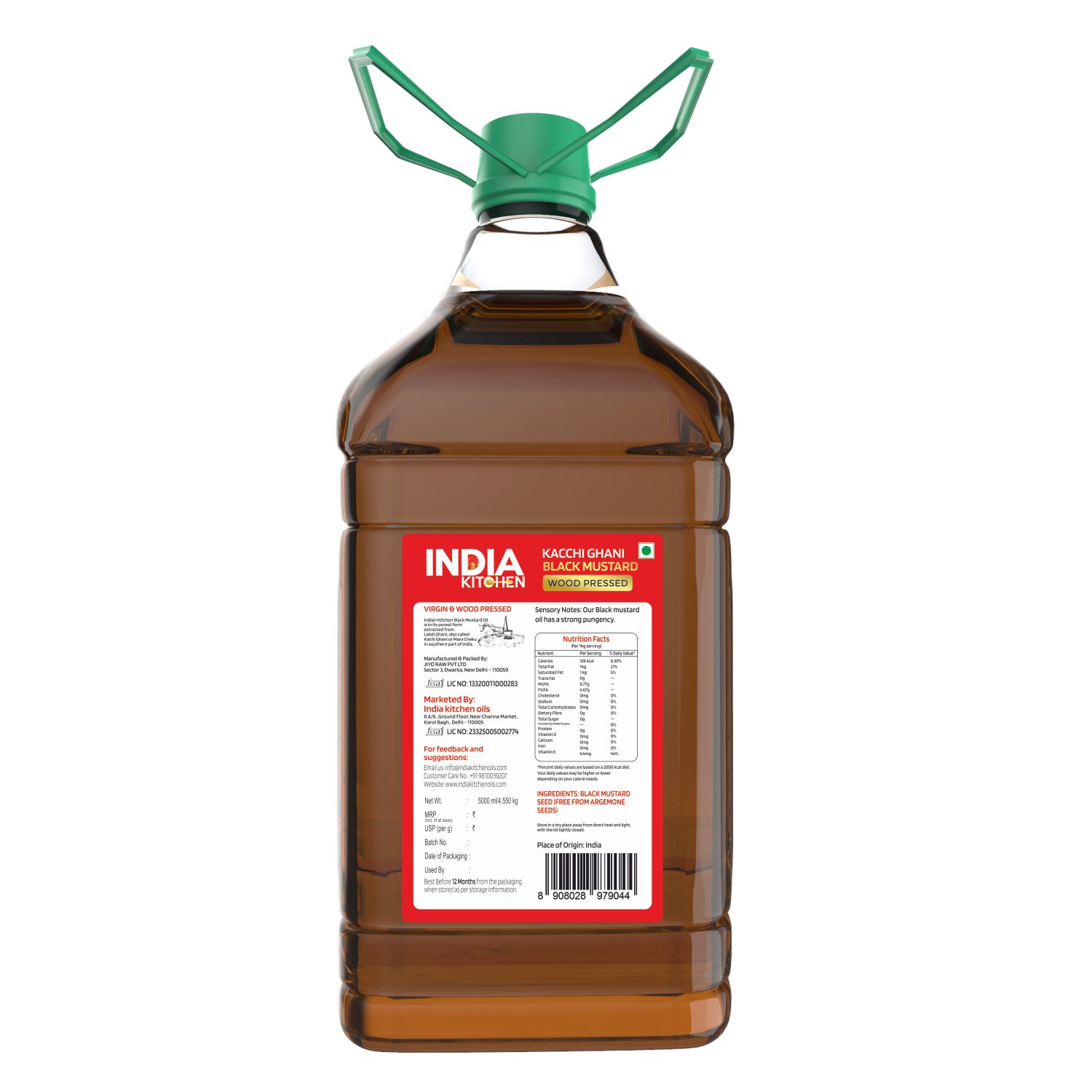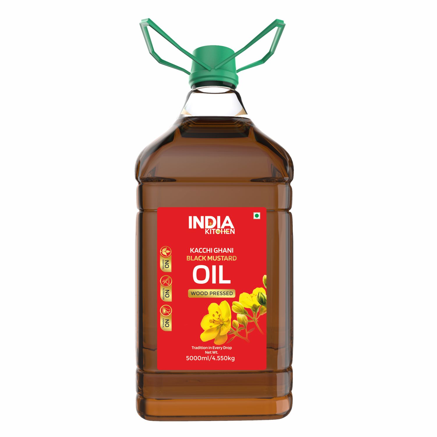 India Kitchen Kacchi Ghani Black Mustard Oil is traditionally wood-pressed from premium black mustard seeds to deliver a strong natural aroma and authentic pungent taste. Free from chemicals and argemone seeds, it is ideal for traditional Indian cooking, pickles, tadka, and deep frying—just like generations have trusted.